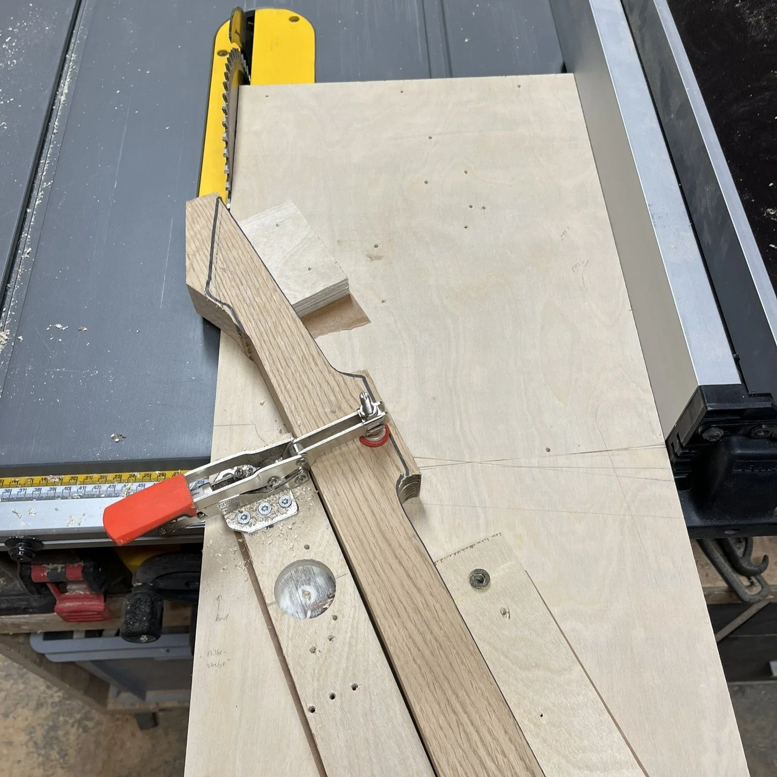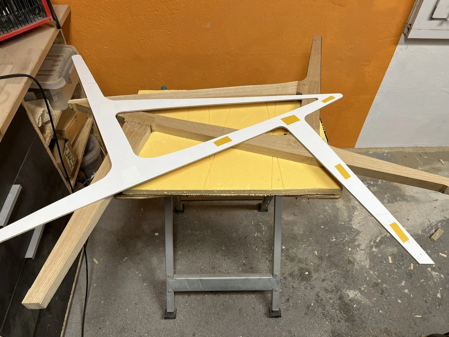 Die tragenden Rahmenteile bestehen aus 30 mm starkem Eichenholz. Die charakteristische Form entstand mithilfe einer selbstgebauten MDF-Schablone, die zuvor auf Basis eines eigenen 3D-Modells konstruiert wurde. Mit einem Bündigfräser ließen sich die Bauteile dann pass- und wiederholgenau ausarbeiten.