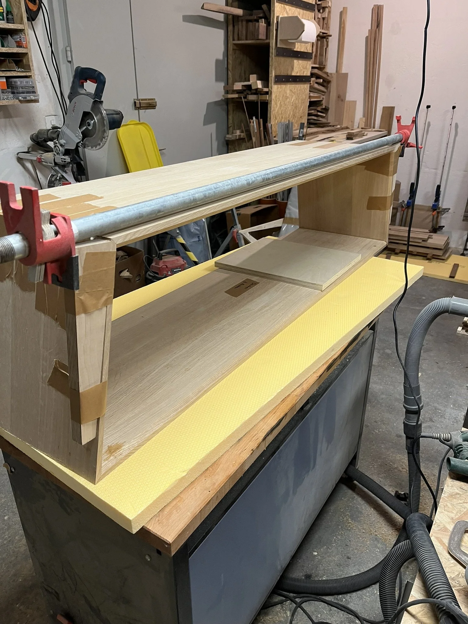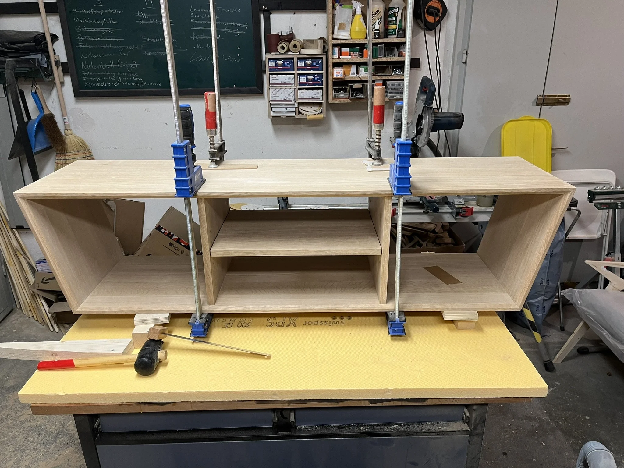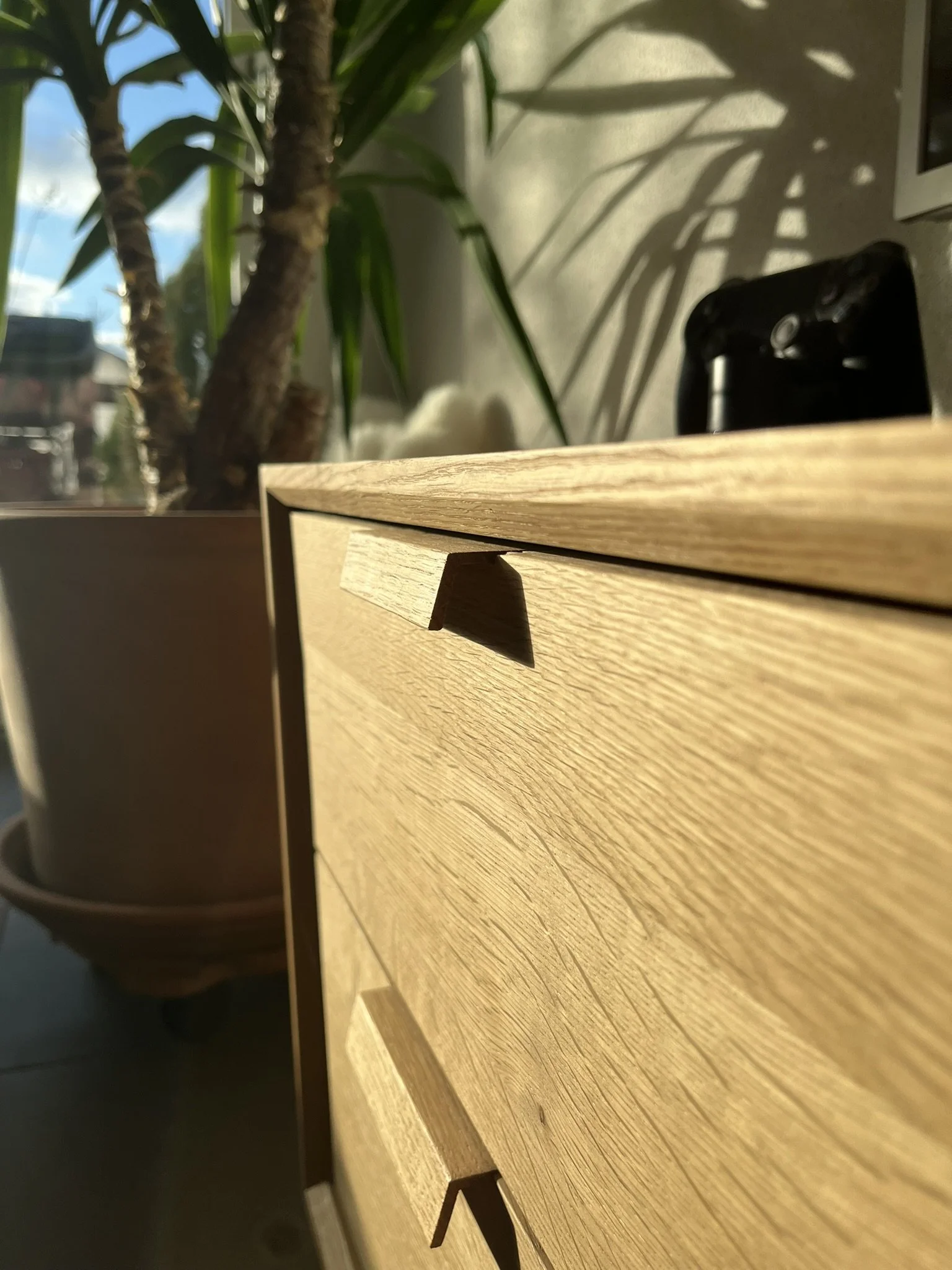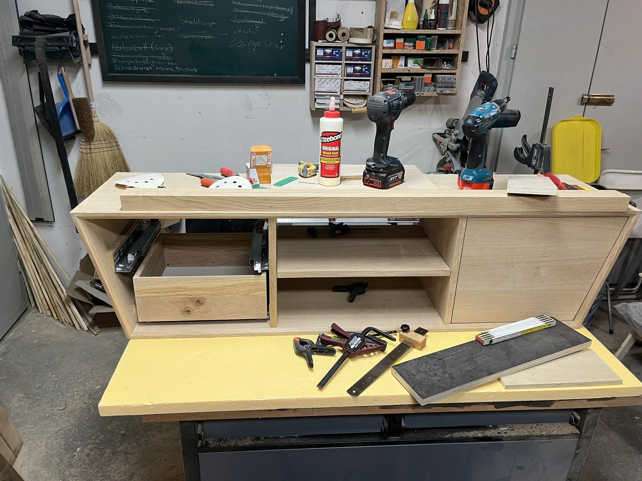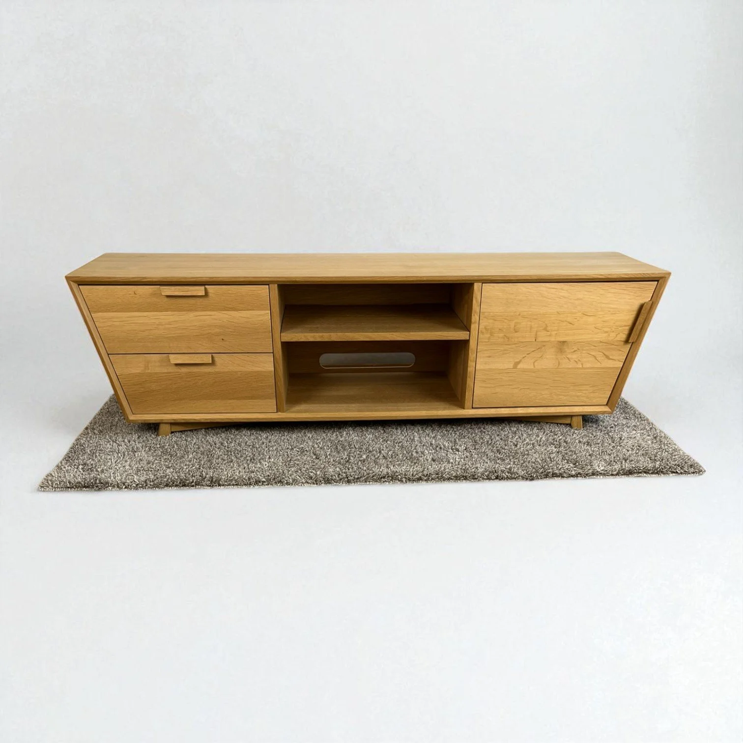 Dieses von Hand gefertigte Lowboard vereint hochwertige Materialien mit einer markanten Formensprache. Das Möbelstück ist vollständig aus massiver Eiche gebaut und besticht durch seine elegante Trapezform, die ihm einen modernen, außergewöhnlichen Charakter verleiht.
