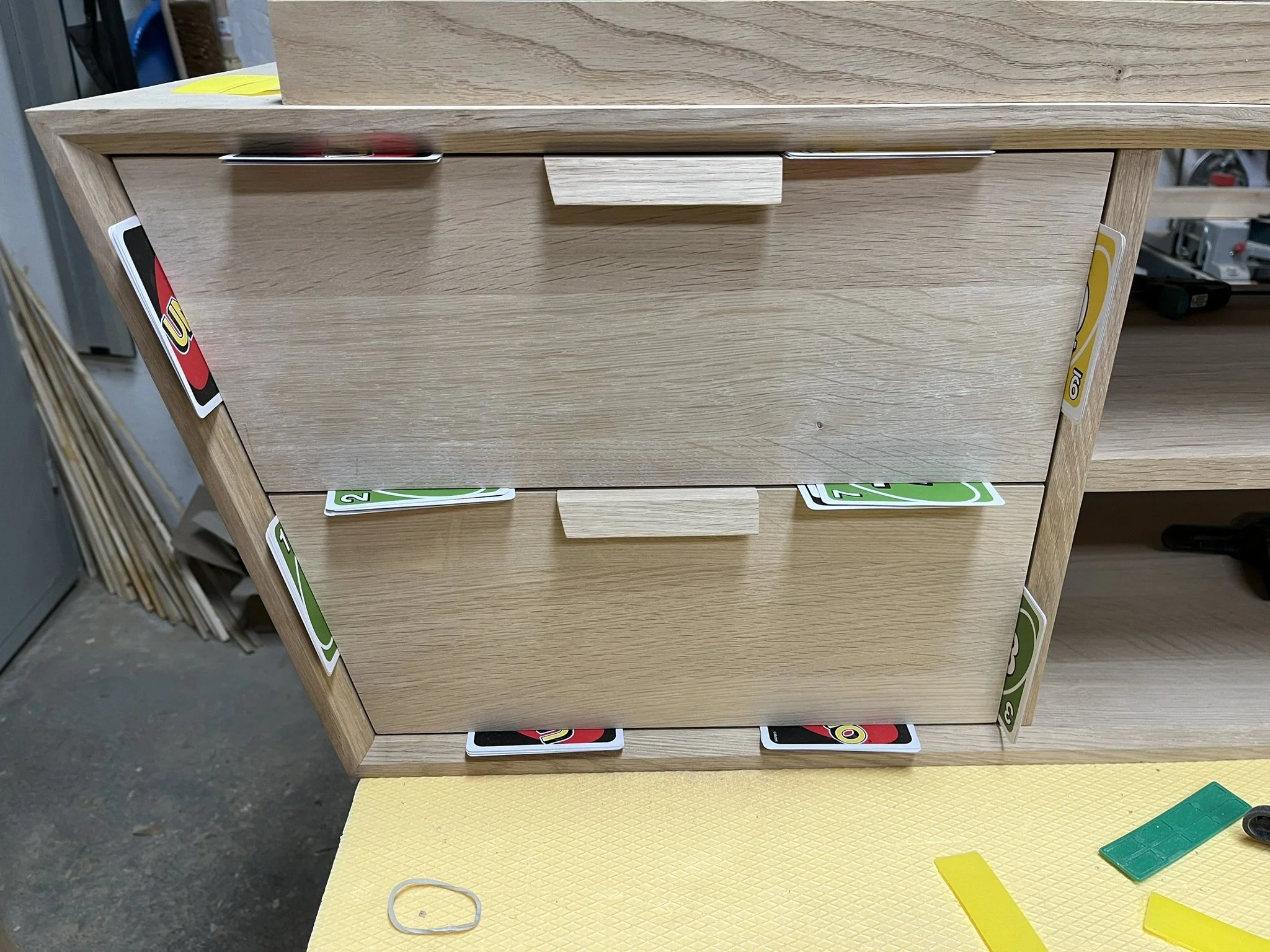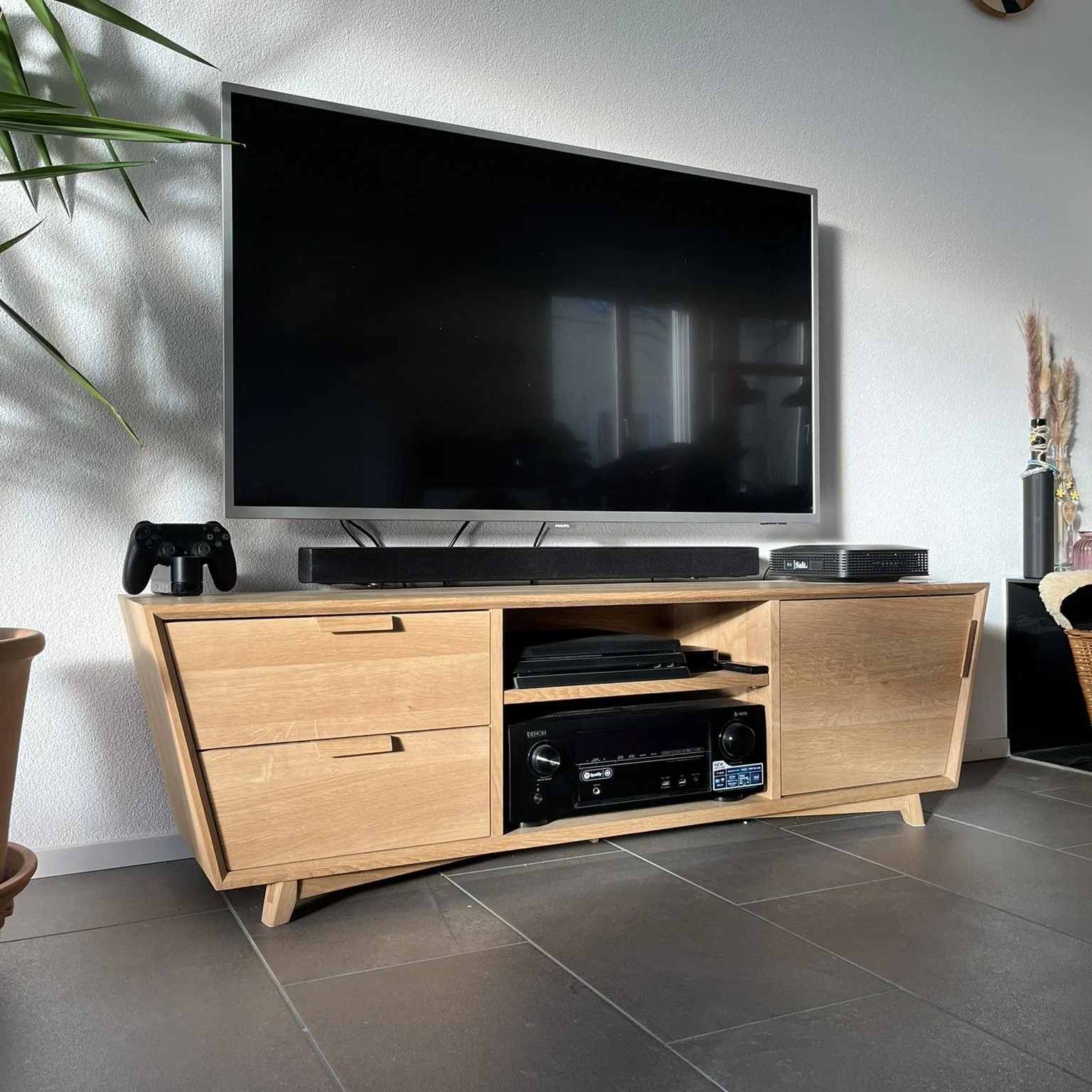 Links: Zwei großzügige Schubladen mit Vollauszug und Soft-Close-Funktion bieten Platz für DVDs, Spiele oder Zubehör.