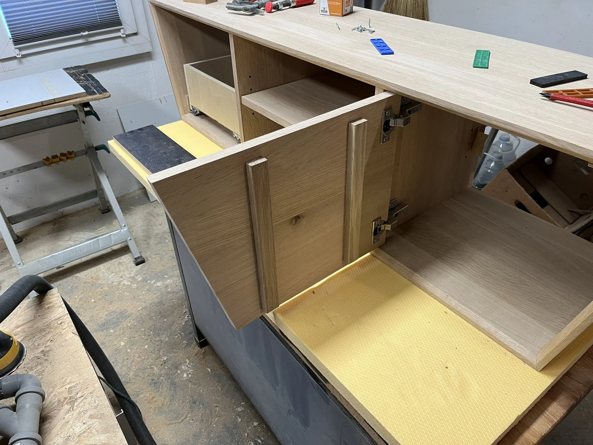 Rechts: Hinter einer Tür mit Tablar verbirgt sich zusätzlicher Stauraum, der für Ordnung sorgt, ohne Kompromisse im Design einzugehen.